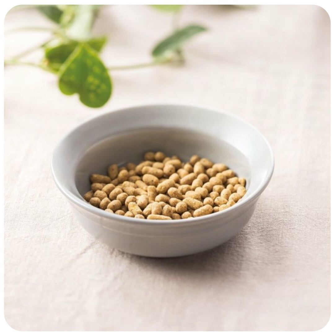 味が濃く、しっかりした肉質のトキワの豚をはじめ、野菜や穀物など日本各地から確かな品質の食材を調達。「茹でる」「炊く」などの下調理をした後、食材の栄養素を壊さぬよう、低温でじっくり乾燥させました。だしのような香りに、サラリとした手触り。食材そのままを活かした、やさしい味わいのドライフードです。