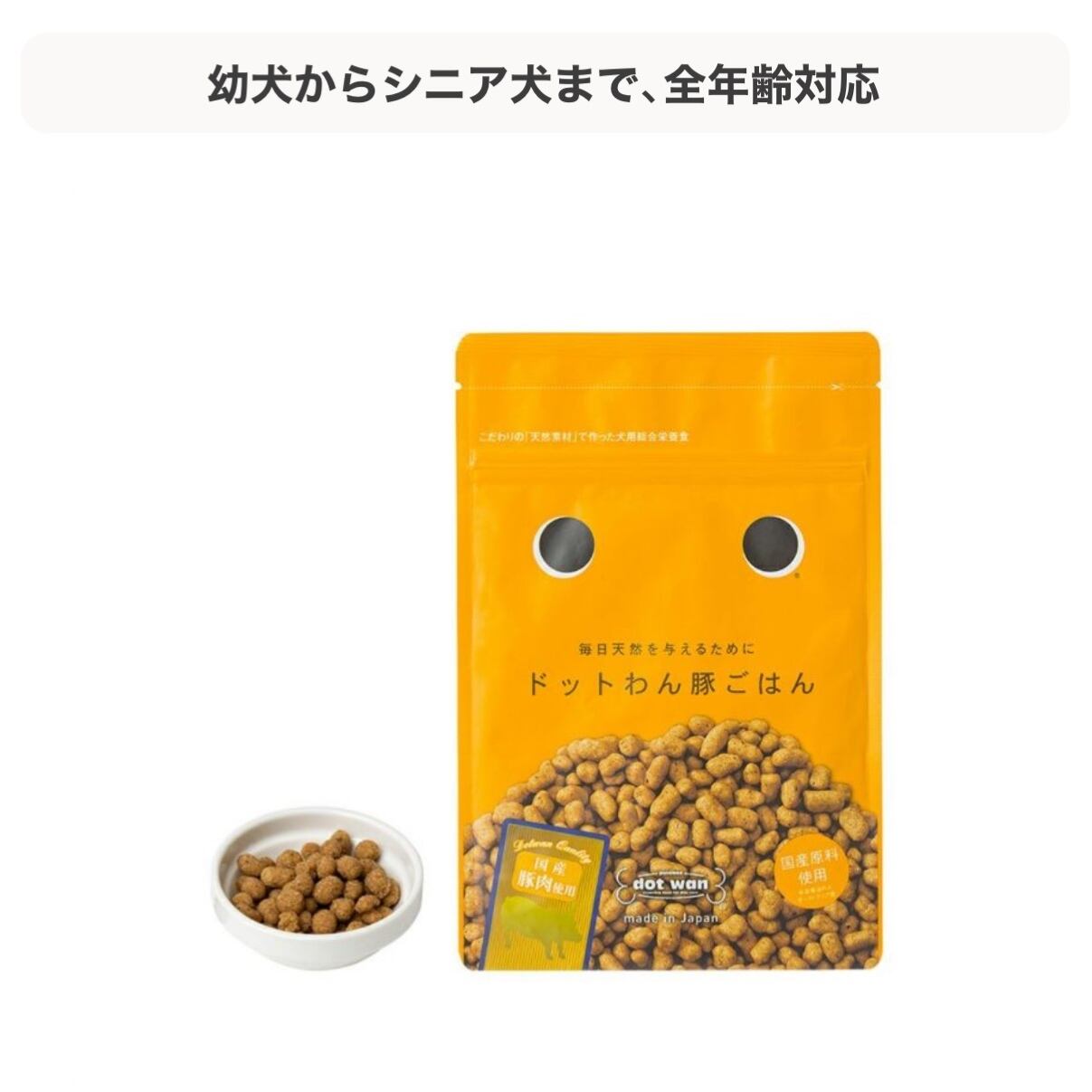 玄米(山形県産・他)、ポークエキス(国産)、白米(福岡県産・他)、豚肉(岩手県産・薬師酪農)、ポークオイル(国産)、ビール酵母(国産)、豆腐おから(埼玉県神泉村産)、食用豚骨カルシウム(国産)、カツオエキス(静岡県焼津市産)、豚肝臓(国産)、カツオ節(国産)、鶏卵(国産)、にんじん(千葉県産・他)、かぼちゃ(国産)、菜種油(オーストラリア産・遺伝子組換えでない)、昆布(北海道産・他)、ビタミン・ミネラル類(栄養添加物は総量の1.5%以内)※塩化カリウム、ピロリン酸第二鉄、グルコン酸亜鉛、ビタミンE、ビタミンB12、グルコン酸銅、パントテン酸カルシウム、ビタミンD
